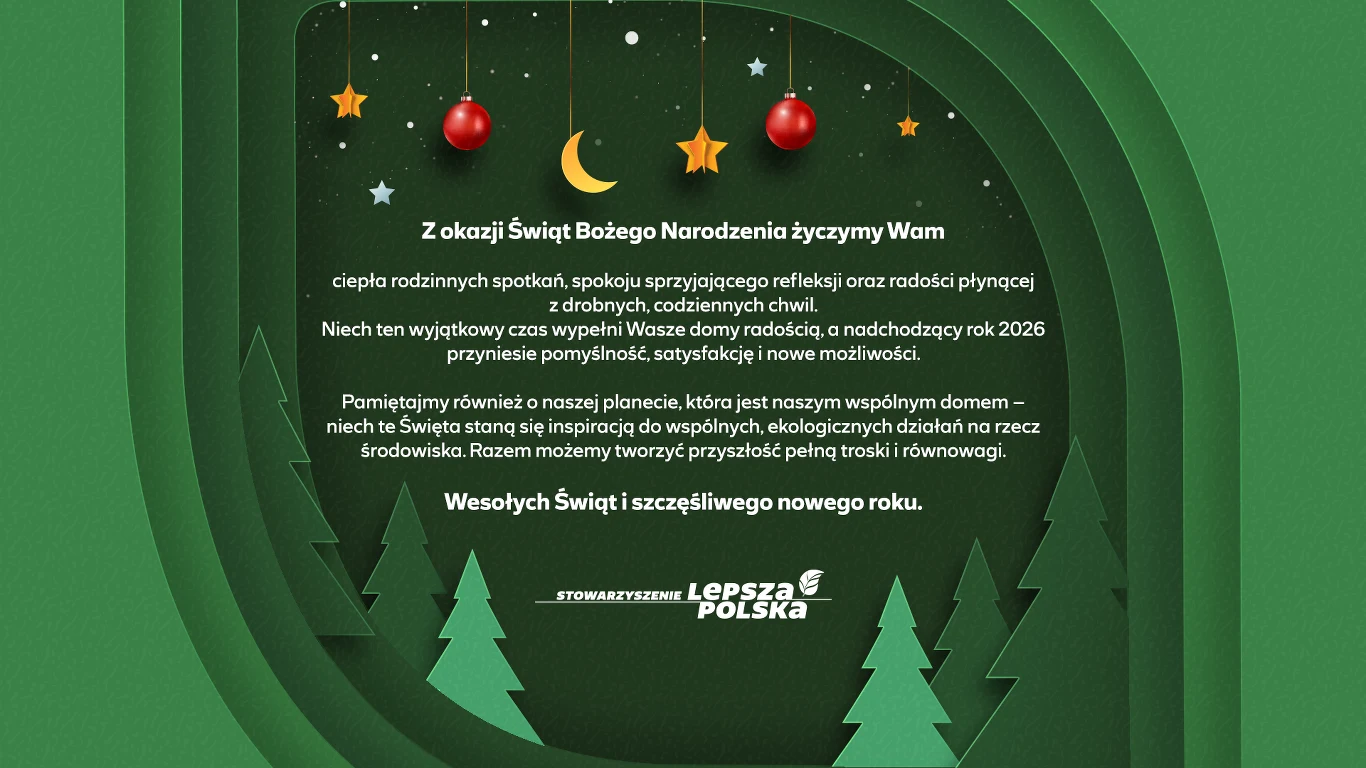 Zielona grafika z papierowymi efektami 3D, ozdobiona choinkami, świątecznymi kulami i złotym księżycem na tle nocnego nieba wraz z życzeniami bożonarodzeniowymi, sygnowana przez Stowarzyszenie Lepsza Polska.