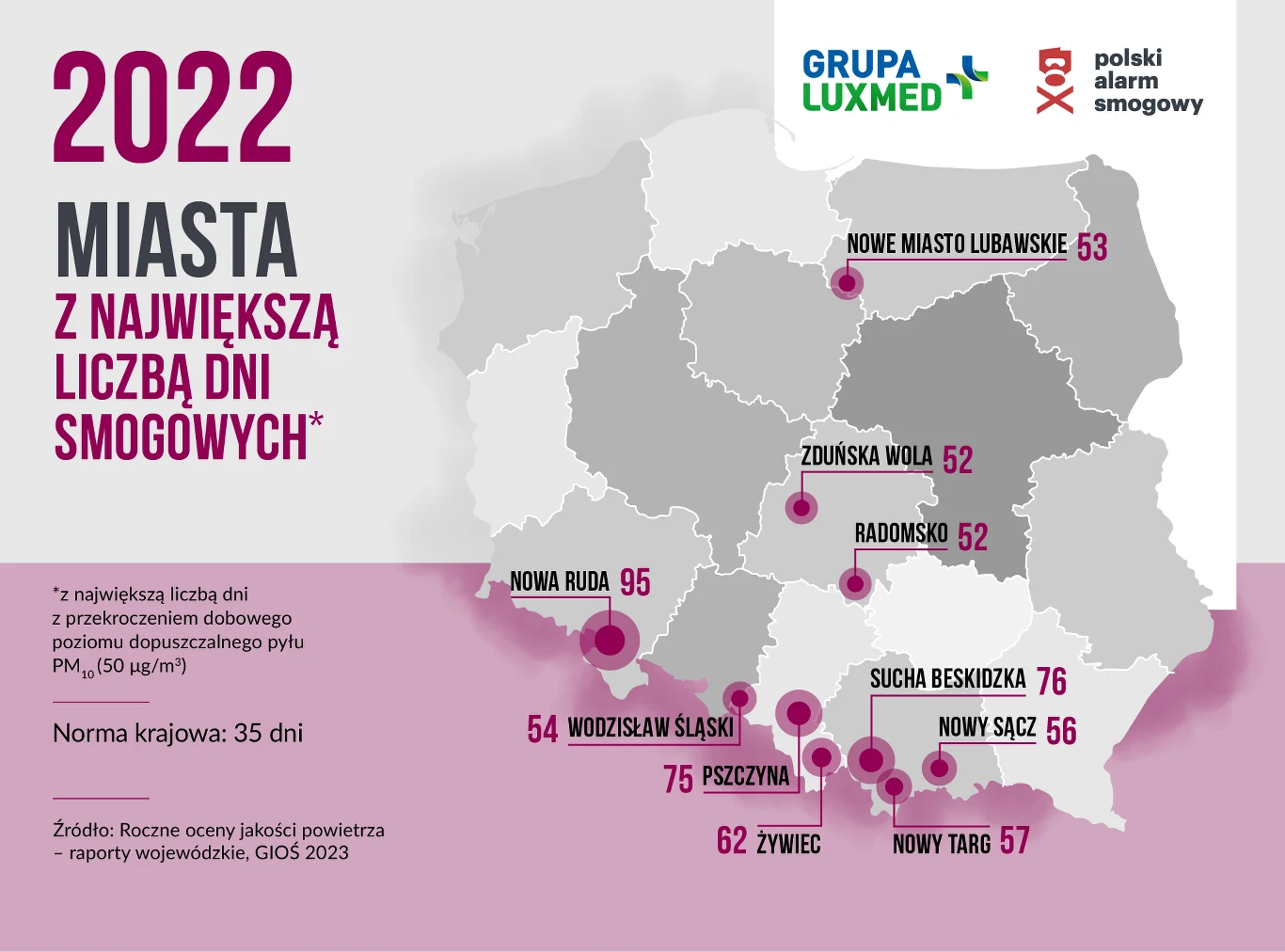 Po raz kolejny Nowa Ruda stanęła na szczycie smogowego podium i to w 3 kategoriach: pod względem liczby dni smogowych, stężenia PM10 oraz stężenia benzo(a)pirenu. W 2022 roku odnotowano tam najwięcej dni smogowych (95), najwyższe stężenie PM10 oraz najwyższe stężenie rakotwórczego benzo[a]pirenu, które wyniosło 9 ng/m3, czyli 900 proc. normy.