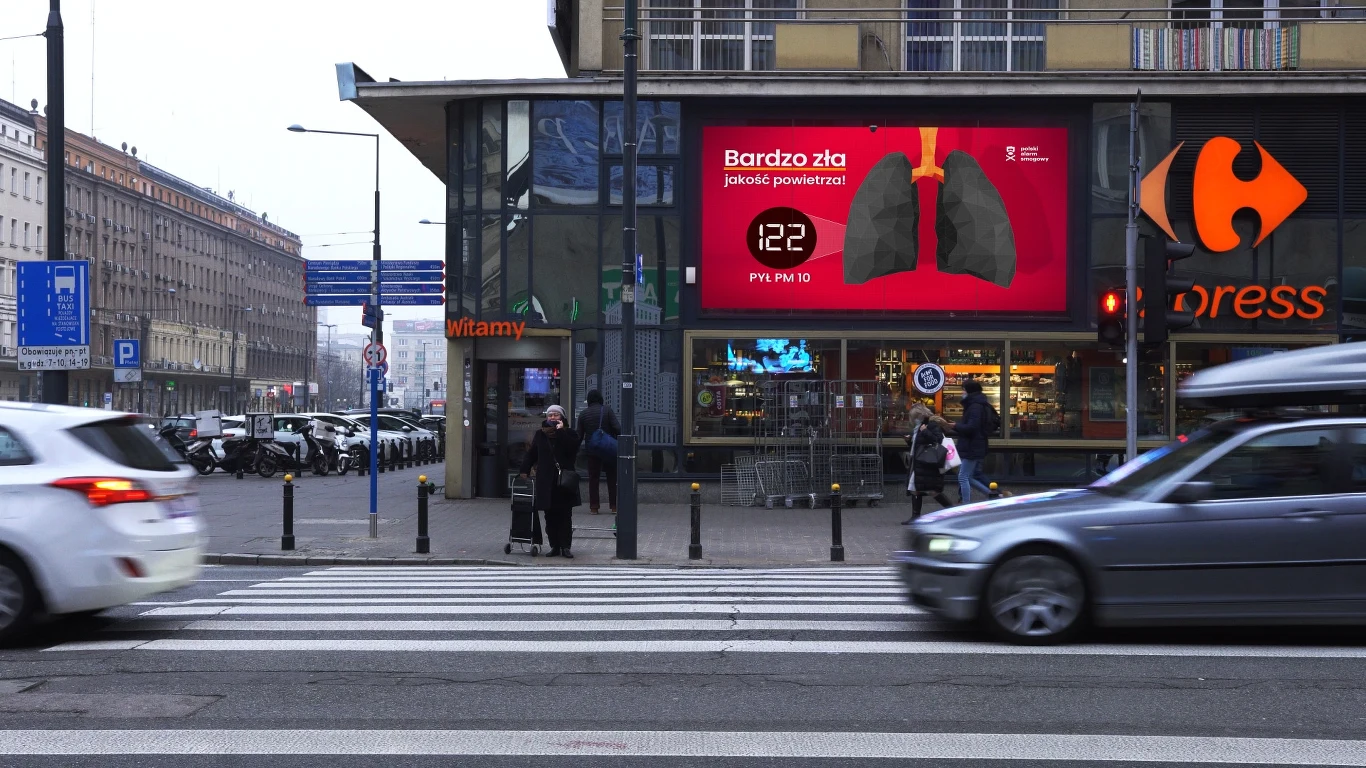 Na ponad 20 tysiącach ekranów, w głównych miastach Polski, wyświetlane będą oddychające płuca, których kolor zależeć będzie od zanieczyszczenia powietrza w okolicy. Dodatkowo na ekranach pojawi się informacja o aktualnym stężeniu pyłów i opis jakości powietrza: średnia, zła albo bardzo zła. Ta edukacyjna kampania ma nie tylko ostrzegać przed smogiem, ale również zachęcać do działania - wymiany starego kotła na nowoczesne źródło ciepła: